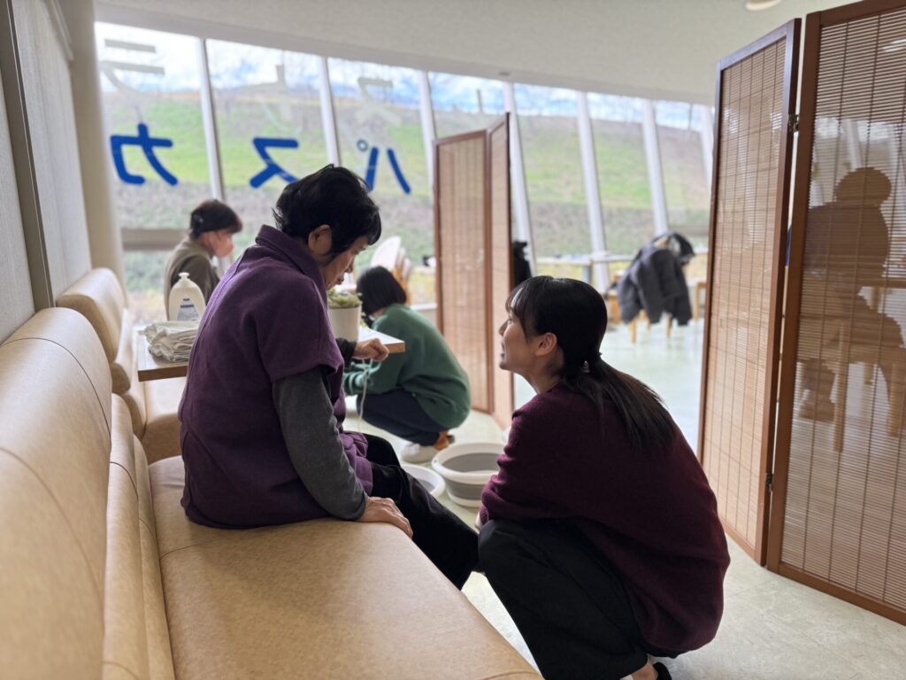学校の先生にご指導いただいたことを活かし、足のマッサージをしながら会話を楽しむことができました。NPO法人ともに様のご協力もありシニアの方々がパスカルに集まってくださり学生にとっても良い経験となりました。